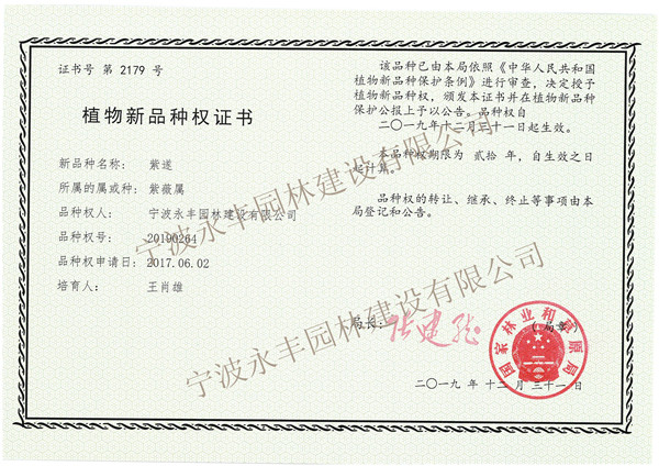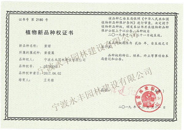 2019年12月31日,经国家林业和草原局发文(2019年第31号)公告,2019年第二批授予植物新品种权名单出炉,其中由宁波永丰园林建设有限公司自主选育的紫红叶紫薇:紫红叶紫色花紫薇“紫遂”、紫红叶主花色紫色副色白色紫薇“紫裙”、紫红叶紫红花“紫夜”获得植物新品种权。