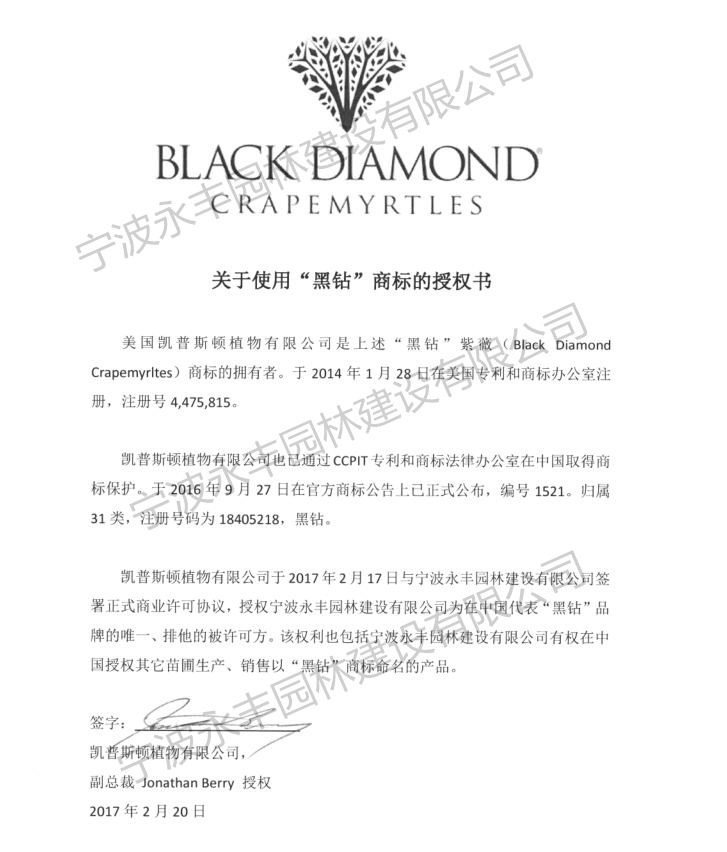2017年2月17日,美国凯普斯顿植物有限公司与宁波永丰园林建设有限公司签署合作协议,副总裁Jonathan Berry授权永丰园林为中国地区使用美国黑钻商标品牌唯一使用人,其授权如下: