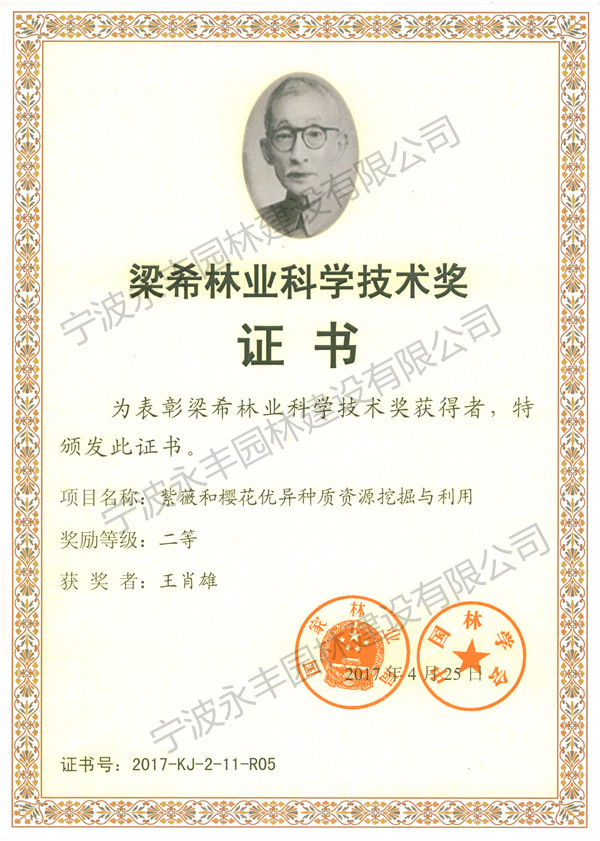 近日,中国林学会颁发了2017年第八届梁希科学技术奖,浙江省选送的 “紫薇和樱花优异种质资源挖掘与利用”项目获得二等奖,完成该项目科研成果的王肖雄,系我宁波永丰园林建设有限公司总经理、子公司宁波林丰种业科技有限公司总经理。