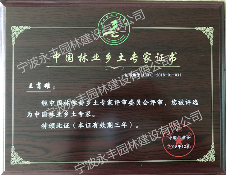 2018年12月,经中国林学会乡土专家评审委员会评审,我宁波永丰园林建设有限公司总经理王肖雄被授予“中国林业乡土专家”称号。