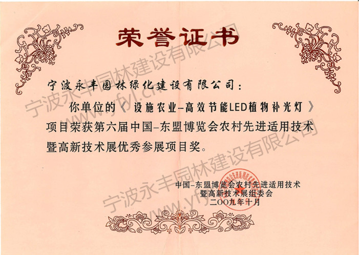 宁波永丰园林绿化建设有限公司主持的“设施农业-高效节能LED植物补光灯”项目荣获第六届中国-东盟博览会农村先进适用技术暨高新技术展优秀参展项目奖。