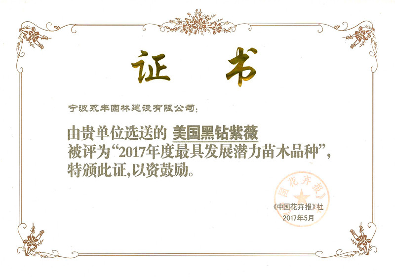 2017年美国黑钻紫薇被《中国花卉报》社评为“2017年度最具发展潜力苗木品种”。